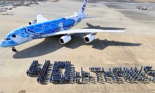 Japan-based airline ANA (All Nippon Airways) has celebrated the 40th anniversary of the launch of its scheduled international flight operations. As part of the celebration, company employees formed the human letters “40th THANKS” and posed for a commemorative photo.