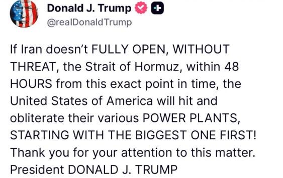 “If Iran does not fully reopen the Strait of Hormuz within 48 hours, we will strike and destroy various energy facilities, starting with the largest.”