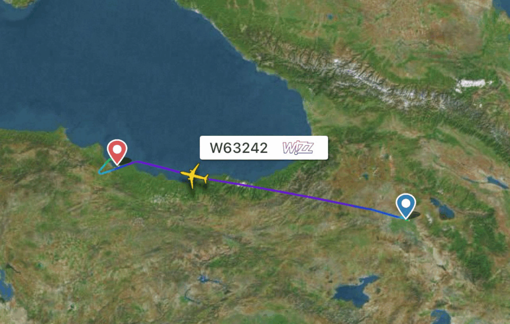 WizzAir’s Airbus A321 aircraft, registered HA-LGT, operating flight #W63242 from Yerevan to Bucharest, diverted to Samsun due to a passenger’s medical emergency.